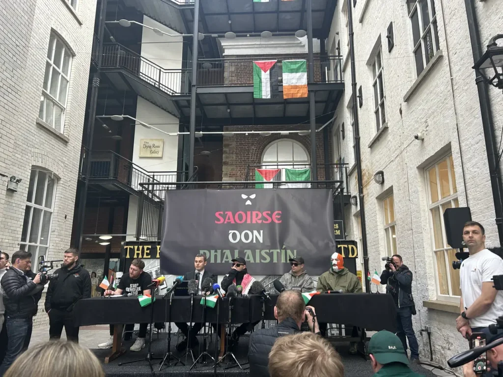 Cuireadh tús spleódrach le Seachtain na Gaeilge i Muileann Mhic Con Midhe in Iarthar Bhéal Feirste ar an 1 Márta agus níos mó ná seachtain ina dhiaidh bhailigh scaifte san áit stairiúil aris fá choinne ócáid a bhí an-difriúil ar fad. Ach bhí pobal na Gaeilge fós i lár an aonaigh agus preasócáid Kneecap ar siúl, i ndiaidh dóibh a chluinstin gur diúltaíodh san Ard-Chúirt i Londain d’achomharc in éadan an chinnidh cás sceimhlitheoireachta in aghaidh Liam Óig Uí Annaidh, Mo Chara, a chaitheamh amach ag deireadh na bliana seo caite. Chuir an grúpa fáilte ollmhór roimh an chinneadh gan an t-achomharc a cheadú agus iad i lár an aonaigh i Muileann Mhic Con Midhe in Iarthar Bhéal Feirste.
